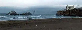 In early morning hours of 8 October 1936, Ohioan ran aground near Seal Rock on the south shore of the Golden Gate, just outside San Francisco Bay. The ship, sailing in a dense fog, strayed too close to shore and grounded on the rocks,[1] sending a shower of sparks that lit up the night.[30] When the fog cleared later in the morning, the ship was firmly seated on the rocks at the base of a 250-foot (76 m) cliff, and some 300 feet (91 m) from the mainland. Coast Guardsmen on shore attached three lines to the ship and set up a breeches buoy to take off the harbor pilot, but the crew stayed on board the ship in hopes that the high tide would free her from the rocky perch. As word of the shipwreck spread, spectators clambered over the cliff to get a view of the scene; one man died from a heart attack and two women broke ankles in separate falls. Newsboys soon arrived on the scene, selling newspapers telling of Ohioan's woe within sight of the stranded ship. Policemen were called out to keep order as the crowd grew into the thousands.[1]