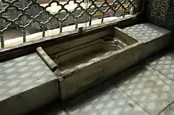 The building is open on three sides and consists of grey and white stones inlaid with marble reliefs. There are also, tiles with embedded pillars at its corners.
