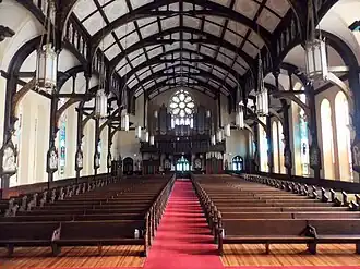 The church features an open interior without columns. There is an extensive amount of woodwork in the interior, including the altars, pews, ceiling, wainscoting, and the gallery frontal. There are four sets of oak pews across the width of the church. The vaulted ceiling is supported by hammer beams. The reliefs below the old high altar depict the sacrifice of Able, Abraham and his son Isaac, and the priest Melchizedek. The three Old Testament images are found in the Roman Canon. The statues of St. Peter and St. Paul were added later. Gold reliquaries that contain relics of various saints are in nooks on either side of the reredos. The shrine of the Blessed Virgin Mary on the left side of the church contains statues of St. Benedict on the left and St. Thomas Aquinas on the right, that were added in 1902. At the base of the altar is a relief of the Dormition of the Virgin. The St. Joseph shrine contains statues of St. Ignatius of Loyola on the left and St. Anthony of Padua on the right that were also added in 1902. At the base of the altar is a relief of Joseph on his deathbed with Mary and Jesus at his side. Initially, the bishop's throne was placed in the archway on the left side of the sanctuary. The large Stations of the Cross are bas reliefs with wood frames that line the sidewalls of the church. They were installed in 1892.