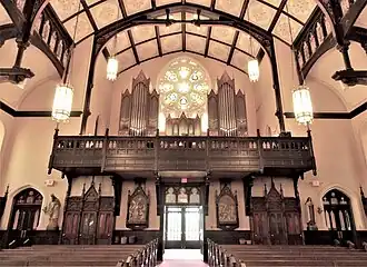 The original pipe organ built in the cathedral had been moved from St. Margaret's Cathedral. It had been donated by Antoine LeClaire. It was replaced in September 1895 by a new instrument arraigned for by Father Davis at a cost of $3,000.[42] Therese Laurent, the cathedral's organist, and the cathedral choir gave a concert of sacred music to dedicate the new organ. Plans to replace that organ began as early as 1944. In 1949 the Kilgen Organ Company approached Msgr. Martin Cone about the possibility of installing an instrument that was intended for St. Rita's Church in Chicago. Construction on their new church had been delayed and so the organ, which was already being built, could be installed in Sacred Heart instead. The offer was accepted and the new pipe organ was installed for $27,000.[43] The Rev. James Greene from St. Ambrose Academy gave a dedicatory concert. The old Kilgen pipe organ was removed in 1991, and replaced with a new Noack pipe organ, opus 119.[44] It was first used for the Silver Jubilee of Bishop Gerald O'Keefe as bishop of Davenport on January 29, 1992.[15]