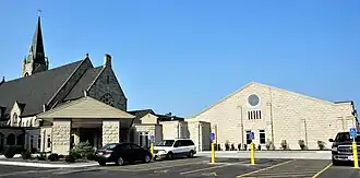 During the pastorate of the Rev. Richard Adam, Bracke-Hayes-Miller-Mahon Architects (BHMM) of Davenport began working with the parish in 2012 to develop a plan to update the parish facilities. A new handicap-accessible entrance on the east side of the cathedral was completed in 2013.[29] In September 2016 construction began on the new hall immediately behind the cathedral. It includes a gathering space, restrooms, a handicap-accessible entrance on the west side, a reception hall, and classrooms.[30] Mark Miller was the principal architect and Swanson Construction of Bettendorf was the contractor. The hall was dedicated by Bishop Thomas Zinkula on November 19, 2017. It was named for parishioners Weir and Pat Sears who gave the first $1 million for the $7 million project.[31] The gathering space was named in honor of Antoine and Marguerite LeClaire. The parking lot was expanded and repaved.