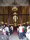 Since its completion in 1888, the cathedral has undergone three major repairs. The first time was in the 1920s and 1930s, when then Bishop Antoine-Pierre-Jean Fourquet, M.E.P. (魏暢茂), replaced the timber roof, beams and steel staircases with concrete ones. A second repair took place after the Cultural Revolution in the 1980s. Recently between 2004 and 2006 the largest repair works were carried out. The church paid ¥3 million and local Catholics donated about ¥2 million for the ¥26 million project, while the rest was covered by the local government. The aim of the restoration was to solve the problem of leakage by rebuilding the whole roof, which was the most challenging task as the rib vault below needed to remain untouched and intact. Most of 19th century stained glass was damaged during wartime and smashed in the Cultural Revolution, so new stained glass was ordered from a Philippine company specialising in church glass.[8] It resulted in the new stained glass carrying English descriptions instead of Latin and French texts of the original French glass. New lighting, audio and CCTV systems were also installed. The original French mechanical clock has long gone, so a new 750,000-yuan clock tailored for the clock tower was ordered from a Chinese clock factory.[8]