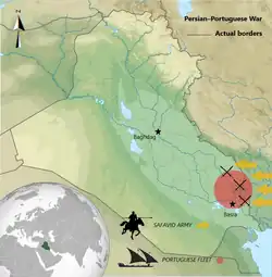 In February 1624, between the Euphrates and Tigris Rivers, D. Diogo da Silveira, under the orders of Rui de Andrada, commanded the Portuguese who in battle defeated and removed the Safavid army from the region. The latter, in its attempt to capture the important port of Basra, commanded by the ruler of Shiraz, mobilized a large army of thousands of men to take over the province.[16]