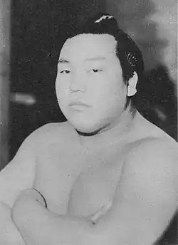 He was promoted to ōzeki due to his performance, but he had already left for a regional exhibition and was informed of his promotion while attending a memorial service for former yokozuna Tamanishiki, who died of appendicitis while an active wrestler. Before the spirit of the departed, through tears, he announced his promotion to ōzeki.