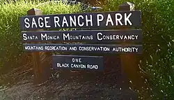 It is an area for a wide variety of recreational activities such as running, mountain biking, hiking, wildlife viewing, photographing, rock climbing, and is also open for camping.[7] Because of its high elevation, you can see as far as the Channel Islands, the Santa Monica Mountains, the Pacific Ocean, and the San Gabriel Mountains on clear days.[8] To get here from Woodland Hills, Los Angeles, follow the Ventura Freeway (U.S. 101) in Woodland Hills, exit on Valley Circle Boulevard and drive north six miles to Woolsey Canyon Road. Turn left (west) and proceed 2.7 miles to Sage Ranch Park. The park entrance is on the left, a short distance past the Rockwell International Santa Susana Field Laboratory, where Woolsey Canyon Road bends north and continues as Black Canyon Road. From Chatsworth, Los Angeles, take the 118 to Topanga Canyon Boulevard, south to Plummer, and then turn right. Follow Plummer to the intersection with Box Canyon and turn left into Valley Circle and then turn right at Woolsey Canyon Road. The entrance to Sage Ranch Park is 200 yards north of the intersection between Woolsey Canyon and Black Canyon Road. From Simi Valley, take Kuehner south and turn right at Katherine Road in eastern Simi Valley. Follow Katherine and turn right after crossing the railroad tracks. At Black Canyon Road, turn left and follow the uphill winding road up to Sage Ranch Park.[1] It is situated in the most eastern part of Ventura County and the Simi Valley city limits. The address is 1 Black Canyon Rd, Simi Valley, CA 93065.[3]