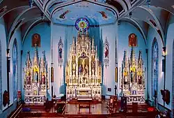The inside of the church consists of numerous paintings and statues. The almost life size stations of the cross inside of the church were added into the church in the summer of 1923 when artisan Matthew Ising was paid to decorate St. Michael's. The original stained glass windows were donated at $100 each. The last remaining stained glass window from when the church was first built is the rose widow above the altar. The present windows were installed in the 1940s. A replacement value of $971,388 was estimated for the stained glass windows in 2015. St. Michael's has three breathtaking altars. There is an altar dedicated to Mary and Joseph and the main altar. Rev. Stephen Rooney (pastor 1995–2008) had the church repainted and remodeled in the late 1990s and the paintings were made to represent how the church once looked in the late 1800s. The three altars were painted, the wall in the middle of the choir loft that covered the stained glass window in the middle of the south end of the church was removed giving off more light, and organ was fixed and replaced. Hardwood floors were also added in the sanctuary and replaced the carpet that was there. In the main altar there are other statues besides the crucifix. They were added in the late 1990s to match the look of how the altar look before the original statues were removed. The original statues were removed in the late 1940s because the altar was leaning forward causing an angel at the top to lose its balance and fall nearly hitting Rev. Bernard C. Loeher (pastor 1947–1949) who was saying mass.They were taken to the basement and then removed from the basement in the 1970s. It is rumored the statues were taken to the city dump for disposal. For years the altar was empty until the late 1990s. The east entrance was also added in the 1980s when the church was being "touched up." The original cost of the church including the large steeple and bells was about $40,000. In 2002 St. Michael's celebrated their 150th anniversary. A book was dedicated to the 150-year history of the church titled Partners in Faith: 150 Years of Saint Michael the Archangel Catholic Church written by Michael G. Roehrig.