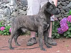 The breed is large but not over-sized; up to a maximum of 60 cm (23.6 ins) at the withers and 35 kg (77 lbs) in weight, with females slightly smaller. The general appearance is of a normally proportioned, deep chested, muscular dog with a broad head and medium length neck, straight back, and long legs. The tail is held up and is slightly curved. The breed has drop ears, unless they are cropped. The coat is a brindle of brown (pale brown is described as fawn) or grey, with black; it is short, smooth and harsh to the touch, with a short fringe on the tail (if undocked) and on the backs of the rear legs.