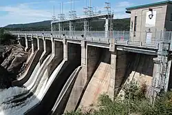 Sainte-Marguerite-1 (SM-1) is located beside Clarke City.[13] The present structure is a 30.5 MW hydroelectric facility owned by Innergex. It was commissioned in 1993 with one turbine, which supplied 8.5 MW. In 2002 two more turbines were added, bringing the plant up to its present capacity.[13] The SM-IA expansion was commissioned in June 2002, adding two fully regulated 11 MW vertical Kaplan turbines to the existing Francis turbine. The river flow is regulated by the SM-3 generating station and reservoir 70 kilometres (43 mi) upstream, which came into service in Spring 2003.[14] The plant was acquired by Innergex (50.1%) and Desjardins Group Pension Plan (49.99%) in 2014, and delivers power under contract to Hydro Quebec. Average annual output is 166,500 MWh.[13]