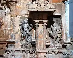 Thiruppurambiyam was the fierce battlefield in the 9th century deciding the bright future of Cholas. Chola king Aditya I built a temple in sweet remembrance of the turn of tide in his favour and named it Aditeshwaram. The present name of the presiding deity is Sakshinathar, and the consort's name is Kuraivilla Azhagi (Goddess with unsurpassed beauty). The sanctum of the consort was built by the Chola King Rajaraja Chola I. The sanctum wall contains beautiful sculptures of Parivara devatas(other deities of Siva temple). Lord Ganesa, the elephant god is performed honey showering on the day of Vinayagar Chaturthi and all the honey showered down on Him is absorbed.[4] The temple is counted as one of the temples built on the northern banks of River Kaveri.[5] An inscription on the west wall of the central shrine belonging to the period of Gandaraditya Chola indicates that a gift of 2 ma of land was given to the temple by Savandi Kumaran, Madevan of Idayarkudi, a local chieftian of Innambarnadu.[6]