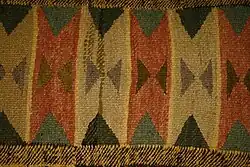 Some red inclusions, found in some blankets, may be made of wool fabric and were used by the Salish weavers in the last quarter of the 1800s. Strips were torn from imported blankets or other materials and used in weaving. It is likely that the introduction of these foreign materials into the weaving was based on colour; strips of richly dyed fabric are common in the later plain or solid style Salish blankets while brightly coloured commercial yarns are included in many of the decorative blankets. In most cases the introduced fabric strips and yarns use colours not available through native plant or mineral dyes.[2]