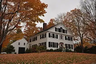 The Salmon Falls area, divided between Buxton and Hollis by the Saco River, developed beginning in the late 18th century as a modest agricultural area, and the falls on the river, for which it is named, were developed in the second quarter of the 19th century with small scale industrial operations. The road that is now Maine State Route 117 was the main road in the area leading north from the port of Saco, and became the focus for development on the Buxton side of the village.[2] One of the first settlers on the west side of the River, Isaac Lane, paid to have a bridge built across the river (roughly now the location of United States Route 202) c. 1794. The area saw growth in the second quarter of the 19th century, but declined economically thereafter, limiting further development.[3]