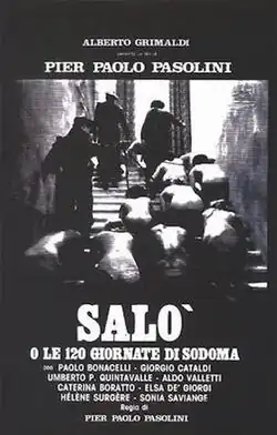 Salò, or the 120 Days of Sodom (Italian: Salò o le 120 giornate di Sodoma), billed on-screen as Pasolini's 120 Days of Sodom on English-language prints[3] and commonly referred to as simply Salò (Italian: [saˈlɔ]), is a 1975 political art horror film directed and co-written by Pier Paolo Pasolini. The film is a loose adaptation of the 1785 novel (first published in 1904) The 120 Days of Sodom by the Marquis de Sade, updating the story's setting to the World War II era. It was Pasolini's final film, released three weeks after his murder.
