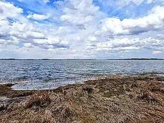 Like other prairie basin lakes, Salt Lake has dry and wet cycles in which the lake will periodically dry out completely.[5] During dry years, exposed wetland mud flats are streaked in white layers of salt.[5]