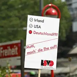 In September 2018, nearly a year after legalization, the AfD introduced a motion to the Bundestag to abolish same-sex marriage. The measure was rejected on 11 October,[113][114] with every other political party opposing the motion. Several Green and CDU/CSU lawmakers instead congratulated the thousands of same-sex couples who had married in Germany in the past year, while other MPs criticised the AfD for their proposal, calling it "undemocratic", "wrong", "a cheap political trick at the expense of free society" or even "lazy as hell".[39] In June 2019, the AfD re-introduced a motion to repeal the same-sex marriage law in both the Legal Affairs Committee and the Family Committee. The proposal was rejected by every other political party. The CDU/CSU stated that "the constitutional concept of marriage is open to same-sex couples". The Social Democrats criticized the AfD for trying to "reopen a completed constitutional debate", while the FDP criticized that a renewed marriage ban for same-sex couples would "reduce their freedom". The Left considered the AfD draft to be a "deliberate provocation aimed at denying equal rights to sexual minorities", and the Greens pointed out that there is "broad political and social majority" support for same-sex marriage.[115] That same month, the AfD presented a motion to the Landtag of Schleswig-Holstein to force the state government to challenge the same-sex marriage law at the Federal Constitutional Court. The motion was unsuccessful and opposed by every other political party in the Landtag.[116][117]