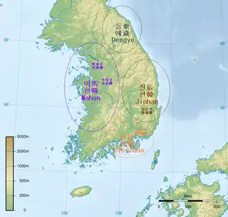 Samhan, or Three Han (Korean: 삼한; Hanja: 三韓), is the collective name of the Byeonhan, Jinhan, and Mahan confederacies that emerged in the first century BC during the Proto–Three Kingdoms of Korea, or Samhan, period. Located in the central and southern regions of the Korean Peninsula, the Samhan confederacies eventually merged and developed into the Baekje, Gaya, and Silla kingdoms.[1] The name "Samhan" also refers to the Three Kingdoms of Korea.[2]