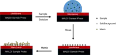 The concentration of salt in the sample is a factor that needs to be considered when preparing a MALDI sample as well. Salts can aid a MALDI spectra by preventing aggregation or precipitation while stabilizing the sample. However, interfering signals can be observed due to side reactions of the matrix with the sample, such as in the case of the matrix interacting with alkali metal ions which can impair the analysis of the spectra. Typically the amount of salt in the matrix only becomes a problem in very high concentrations, such as 1 molar.[23] The problem of having too high a concentration of salt in the sample can be solved by first running the solution through liquid chromatography to help purify the sample, but this method is time-consuming and results in the loss of some of the sample to be analyzed. Another method is focused on purification once the sample solution is deposited onto the sample probe. Many sample probes can be designed to have a membrane on the surface that can selectively bind the sample in question to the probe surface. The surface can then be rinsed off to remove all unnecessary salts or background molecules. The matrix of appropriate salt concentration can then be deposited directly onto the sample on the probe surface and crystallized there.[23] Despite these negative effects of salt concentration, a separate desalting step is usually not necessary in the case of proteins, because the selection of appropriate buffer salts prevents the occurrence of this problem.[27]