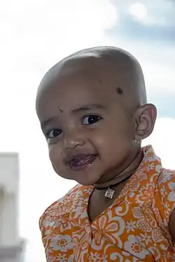 Chudakarana (IAST: Cūḍākaraṇa, Sanskrit: चूडाकरण) (literally, rite of tonsure), also known as choulam, caula, chudakarma, mundana or "mundan sanskar" is the rite of passage that marks the child's first haircut, typically the shaving of the head.[51] The mother dresses up, sometimes in her wedding sari, and with the father present, the baby's hair is cut and the nails are trimmed.[57] Sometimes, a tuft of hair is left to cover the soft spot near the top of baby's head.[51][57]