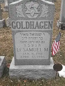 Samuel Milton Goldhagen (January 6, 1918 – April 12, 1945) was an American Army Air Corps commissioned officer who served during World War II in the Pacific and European theaters. He initially enlisted June 9, 1941,[1] and from his barracks, sent a letter[2] to President Franklin Roosevelt, as a Jewish American, imploring the need to defeat Nazism, and to extend the service term of the enlisted soldiers. A return letter was sent by the White House which included the actual pen used by President Roosevelt to sign the extension of the American draft in preparation for the war effort. Goldhagen's service included hosting a military support dinner with Hollywood film stars of the day, was present at Pearl Harbor during the attack, and as B-24 Bombardier, became a German POW, and ultimately died from his injuries that occurred during his final mission over Munich, Germany.