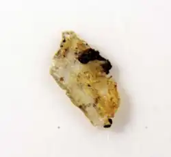 The mineral has a pale yellow color and has a hardness of 5 on Mohs scale.[3] The crystal is generally yellow, flat, and with straited crystals and blue trolleites.[5] Samuelsonite is monoclinic. There are three vectors of unequal length in this crystal system. The three vectors form a rectangular prism with a parallelogram at the base. Therefore, two of the vectors are perpendicular, while the third makes an angle that is not equal to 90°.[6] Samuelsonite has biaxial birefringence (trirefringence), meaning when light passes through the optic axis it is split into two rays due to the difference in refractive index of the ray with parallel polarized light compared to the ray with perpendicular polarized light.