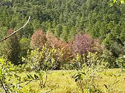 Since it is located on the mountains, the main forests are Pines and Oaks. In 2020, it had 12.4 kha of natural forest.[2] Its elevation above sea level is the proper one for coffee plantations. Its mountains and hills are very high and steep. It has several water spring running down the steep hills. One curiosity is a huge rock monolith on the way to the departmental capital, which proves the volcanic origins of the rocks in this municipality and the rest of the department.