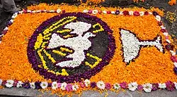 On the morning of 2 November, grave cleaning and decoration begins in earnest. Graves in the main cemetery, which surrounds the Church of San Andres Apostal, are decorated with flowers, especially cempasúchil, candles and other items. The tombs are decorated carefully and sometimes elaborately, making images of the Virgin, cross or other icons with flowers, flower petals or colored sawdust. These graves are prepared for the Alumbrada, which begins at eight pm when the church bells ring yet again. By this time, the church has its own large ofrenda and its lights are dimmed.[2] At this hour, the cemetery around the church is full of color from the flowers and glowing due to the light of thousands of burning candles and thick smoke from copal incense.[2][10]