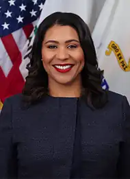 Willie Brown is the first black mayor of San Francisco. London Breed is the first black female mayor. Breed was a District 5 supervisor and president of the Board of Supervisors, who won a special election following the death of Mayor Ed Lee on December 12, 2017. Breed served out the remainder of Lee's uncompleted term (until January 8, 2020), after which she was eligible to run for two full terms of her own. She won the 2019 San Francisco mayoral election[18][19] but lost the 2024 San Francisco mayoral election.