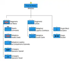 The 1st San Marco Regiment (Italian: 1° Reggimento San Marco), located in Brindisi, is an amphibious formation of the Italian Navy. They are the Italian marines. Until the middle of the 1990s the unit was known as the San Marco Battalion (Battaglione San Marco), until it was expanded beyond battalion size because of the new geopolitical situation after the end of the Cold War and an increasing number of international missions, after as the San Marco Regiment. In 2013 it became part of the San Marco Marine Brigade as 1st San Marco Regiment.
