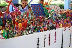 Promotion and protection of the product is a significant concern, spurring the creation of fairs, markets and legal protections. Every Friday on the main square is the “tianguis del alebrije” or weekly market selling wooden figures. This event allows visitors to purchase items from local craftsmen directly. There are usually also vendors selling other local products such as ice cream as well.[25] The Feria del Alebrije invites more than 100 vendors who sell alebrijes, textiles, local dishes, artwork and local alcoholic beverages. The fair lasts for about nine days and has been held since 2008.[18][26] The Master Craftsmen Group of Tilcajete (Grupo de Maestros Talladoes de Tilcajete) includes Hedilberto Olivera, Emilia Calvo, Roberta Ángeles, Juventino Melchor, Martin Melchor, Margarito Melchor Fuentes, Margarito Melchor Santiago, José Olivera Pérez, Jesús Melchor García, Inocente Vásquez, María Jiménez, Cira Ojeda, Jacobo and María Ángeles, Justo Xuana, Victor Xuana, Rene Xuana, Abad Xuana, Flor and Ana Xuana, Rogelio Alonso, who works in Papier-mâché and Doris Arellano, who is a painter.[19] The group is also working to create a group trademark for their work because of the introduction of imitation alebrijes from China. The trademark is to be called “Tonas de Oaxaca, Figuras de Madera” with over 39 craftsmen from Tilcajete, Arrazola and San Pedro Taviche already completing the requirements to participate.[15]