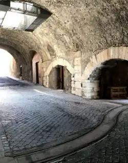 In late republican and imperial times the traffic that crossed the city of Tibur (and therefore the sanctuary) had increased to the point that it was necessary to set up rest and sorting camps for wagons and herds, with related assistance and health control services, upstream and downstream of the bridge (the Roman bridge probably fell in the great flood of 105 AD[14]) which crossed the Aniene near the temples of the Acropolis (also built at the beginning of the splendour of the city, II-I century BC). The rest camps upstream (towards Abruzzo) were probably in Crocetta, about 2 km from the city; those downstream from the clivus tiburtinus almost reached the Lucan bridge. These lands were all owned by the sanctuary.