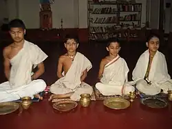 Sandhyavandanam (Sanskrit: सन्ध्यावन्दनम्, romanized: sandhyāvandanam, lit. 'salutation to (Goddess) Twilight', or 'salutation during the twilight') is a mandatory religious ritual centring around the recitation of the Gayatri mantra, traditionally supposed to be performed three times a day by Dvija communities of Hindus,[1][2] particularly those initiated through the sacred thread ceremony referred to as the Upanayanam and instructed in its execution by a Guru, in this case one qualified to teach Vedic ritual.[2] Sandhyopasana is considered as a path to attain liberation (moksha).