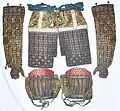 Antique Japanese (samurai) sangu, the three armours of the extremities, kote (armoured sleeves), suneate (shin armour), haidate (thigh armour)