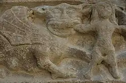 The entrance features a pointed frontispiece with four sloping archivolts supported by fluted columns with original capitals, a lintel and a pediment. The capital on the left features a floral pattern while the right, two devouring monsters, a type of winged lion that swallow a person whole. The lintel at the center features a small rhomboid emblem in bas-relief depicting tools of the trade of the master of the house.