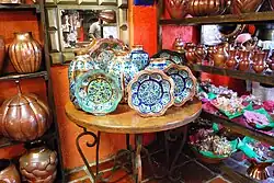 The center of town is made of two plazas. One contains a kiosk with a copper roof, as well as benches and garbage cans painted to look like copper. Facing this plaza are many shops selling copper wares. Next to it is a plain plaza onto which face the town's two main churches, the Parish of Santa Clara and the Chapel del Hospital.[4] Just off the kiosk plaza is the Museo del Cobre (Copper Museum). The museum holds a collection of hand-hammered copper items from the pre-Hispanic period to the winners of the town's annual copper festival each year to the present, as well as national and international competitions. One section contains workshops in which classes are given and it is also home to the Unión de Artesanos (Artisans’ Union) which accredits smiths and products in order to conserve and further develop the craft.[1][7][9]