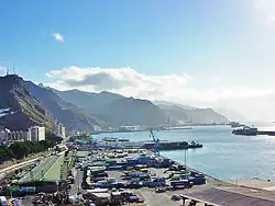 Santa Cruz is located in the northeast quadrant of Tenerife, 210 kilometres (130 mi) off the north-western coast of Africa within the Atlantic Ocean. The distance to the nearest point of mainland Spain is 1,300 kilometres (810 mi). Between the 1833 territorial division of Spain and 1927, Santa Cruz de Tenerife was the sole capital of the Canary Islands, until 1927 when the archipelago was split into the current two provinces.[8][9] The port is of great importance and is the communications hub between Europe, Africa and Americas, with cruise ships arriving from many nations. The city is the focus for domestic and inter-island communications in the Canary Islands.[10]