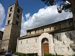 The church was begun in the 13th century, but the present church was altered over the centuries. The present main entrance is a façade on the right nave, which has both Romanesque and Gothic elements, and has a single portal. The belltower, detached from the church likely reutilizes a former private watchtower, now complete with mullioned windows. the interior is divided into a nave and two aisles by alternating pilasters and columns. A 1950–1954 restoration uncovered traces of 13th-century frescoes, including an Enthroned Madonna and Child between St John the Evangelist and St Michael the Archangel weighing souls. The church also houses the 15th-century, travertine marble tomb monument of Nicola Pizzuti, built as a gothic-renaissance style tabernacle, with frescoes of the school of Carlo Crivelli in the spandrels, depicting the Evangelists and Cardinal Virtues.[1]