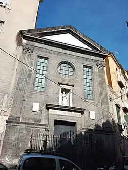 The church was founded in 1573–75 by the Fabrizio Pignatelli, brother of the second duke of Monteleone, knight of the Priory of Jerusalem (Gerosolimitani or Knights Hospitaller), and former Bailiff of Santa Eufemia in Calabria. As a knight or leader of knights, Pignatelli had fought in the defense of the Siege of Rhodes (1522), Tripoli (1544)(see Siege of Tripoli (1551), and Siege of Malta (1565).[1] The church was constructed adjacent the Hospital of "Santissima Trinità dei Pellegrini". Upon the death of the patron, the church was then ceded to Archiconfraternity which already ran the hospital.