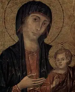 The Santa Trinita Maestà (Italian: Maestà di Santa Trinita) is a panel painting by the Italian medieval artist Cimabue, dating to c. 1288-1292. Originally painted for the church of Santa Trinita, Florence, where it remained until 1471, it is now in the Uffizi Gallery of Florence, Italy. It represents the Madonna enthroned with the Baby Jesus and surrounded by eight angels and, below, four half portraits of prophets.
