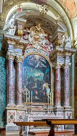 However, the grand project almost immediately suffered a major setback, caused by the tragic events of the reconquest of Brescia by Milan at the hands of the French, which would end with the bloody sacking of 1512.[26] The building revival of the monastery, most likely, was not to take place in the years immediately following, as Venice regained possession of the city once again: from 1520 onward, however, the works experienced intense activity.[27] In 1532 the organ by Gian Giacomo Antegnati was installed, while the structures of the monastery, especially the cloisters and the new dormitory, were substantially completed.[27] However, in the second half of the century, Lattanzio Gambara frescoed the entire presbytery area: his work would be admired a few years later, in 1566, by Giorgio Vasari, who was visiting Brescia.[28][29] Meanwhile, master builder Geronimo Tobanello, who was already working in other areas of the monastery, took care of the first adaptations of Renaissance architecture inside the church, affixing on the walls of the aisles, around the chapels, a rhythmic succession of marble lesenes, all designed by Giovanni Maria Piantavigna.[28] The first chapel on the right was also renovated, building a new altar reusing parts of the old one and dedicating it to St. Michael the Archangel.[28] The work was taken over during the visit of St. Charles Borromeo in October 1580,[30] who took note of both the embellishment lesenes and the new chapel and ordered that the north wall of the church, which had remained intact up to that time, be broken through to create three new mirrored chapels.[31]