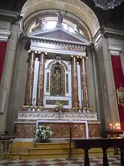 Reconstruction work began from the chancel, which in 1604 was lowered through the destruction of the crypt, relocating the relics kept there.[33] Those of the two patron saints were still in the marble ark of Ramperto, enriched by the small columns added more than a century earlier: the whole was, for the time being, simply reassembled in the new presbytery.[32] Likewise, the relics and altar of St. Honorius were moved and reassembled in the back chapel of the right aisle.[34] The final impetus for the continuation of the renovations came unexpectedly from the Municipality of Brescia, which on November 14, 1609 resolved to build, using public money, a new sepulchral ark of the two saints, in the opinion of the councilors by then unsuitable and worthy of greater attention to keep up popular devotion.[32] The contract with sculptor Giovanni Antonio Carra was signed in 1618, finally paving the way for the radical reconstruction of the church.[35]