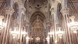 A particular parvis surrounds the sanctuary: it is paved with small river pebbles which create unique and elegant geometrical and floral patterns.[2] The façade has a rose window made with tufa and coloured glasses. Its interior shape is a Roman cross with three different naves, divided by columns in brickwork and painted with marble effects, from which acute sixth arches (calling back the Gothic) raise.