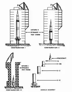 Dynamic tests came in three configurations, one for each phase of Saturn V-powered flight. Configuration I focused on testing the entire stack, as if the vehicle had just been launched. Configuration II exercised the stack as if the first stage had jettisoned and the second stage were firing, and configuration III tested just the third stage and Apollo spacecraft. Tests began with Configuration III in the Saturn IB dynamic test facility, while the Saturn V dynamic test stand, first, and second stages were still under construction. Configuration I testing followed in the Saturn V dynamic test stand, then Configuration II in the same place.[4]
