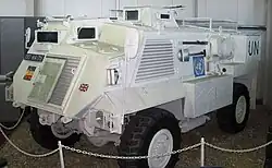A British Army Saxon ARV on display at the REME Museum painted in UN colours.