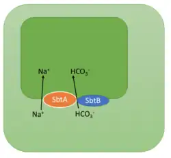 SbtB is part of the cyanobacterial CCM (CO2-concentrating mechanism) system.[11] It acts as a post-translational regulator (inhibitor) of the SbtA protein (one of the three sodium-dependant bicarbonate (Na+/HCO3) symporters in the cytoplasmic membrane) by binding to it during the dark hours to prevent rising levels of Na+ from growing and becoming toxic for the cyanobacterial cell.[19] The SbtB protein is crucial for the photosynthetic process as it inhibits the SbtbA protein via direct interaction between both proteins. It is therefore a regulator of the Na+/HCO3 transporter[11] and is responsible for the cyanobacterial inorganic carbon response via cAMP sensing.[2]