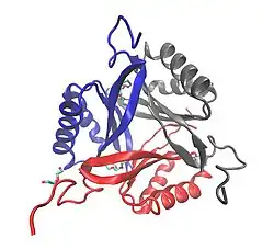 Cartoon representation of SbtB (PDB: 5O3P​ done with VMD.[1] Each color represents one of the 3 chains from the protein.[2]