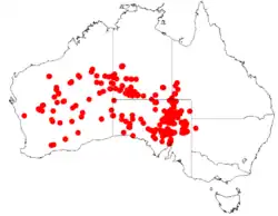 It is found on saline soils in the arid parts of the south of Western Australia, the south of the Northern Territory, South Australia, western Queensland and north-western New South Wales.[4]