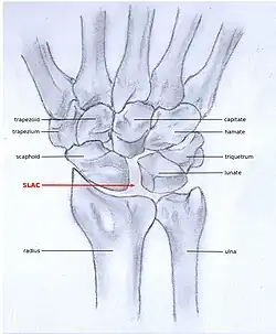 - ^ a b c d e f Shah, CM; Stern PJ (2013). "Scapholunate advanced collapse (SLAC) and scaphoid nonunion advanced collapse (SNAC) wrist arthritis". Curr Rev Musculoskelet Med. 6 (1): 9–17. doi:10.1007/s12178-012-9149-4. PMC 3702758. PMID 23325545.