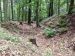 The Alte Burg on the peak of the Reuschberg is a sort of circular rampart, with remains of both earth and masonry walls, long thought to date to the La Tène period. However, excavations in 2005 indicate that it most likely is a 10th-century refuge castle, with some elements added later (11th or 12th century). Over the centuries, locals have used the fortification as a source of construction materials, reducing the remains to just foundations. The fortifications are roughly oval in form and encompass an area of roughly 1,300 square meters. A break in the wall likely once served as a gate. Research also revealed signs of internal buildings, including the foundation of a central tower.[5][6]: 24