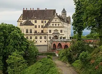 Inside the south wing overlooking the Bodensee, the Knights' Hall (German: Rittersaal) was constructed between 1580 and 1584, one of the most magnificent ballrooms of the late German Renaissance.[1][4][5] The room is, together with the knight's hall in Schloss Weikersheim, one of the few surviving state rooms of this time.[1] The richly carved coffered ceiling hanging from the roof structure was created by Jörg Schwartzenberger from Meßkirch.[1][2] The chimney structures on the sandstone chimneys on the narrow sides with niche and column figures were created in 1584 and probably come from Hans Morinck.[1]