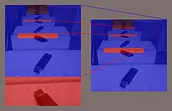 | Mirror-in-mirror images as counterexample: The left image can be embedded into the right one and vice versa (below, left/mid); yet, both aren't similar. The Schröder-Bernstein theorem applied to the unstructured pixel sets obtains a non-continuous bijection (right). | ||