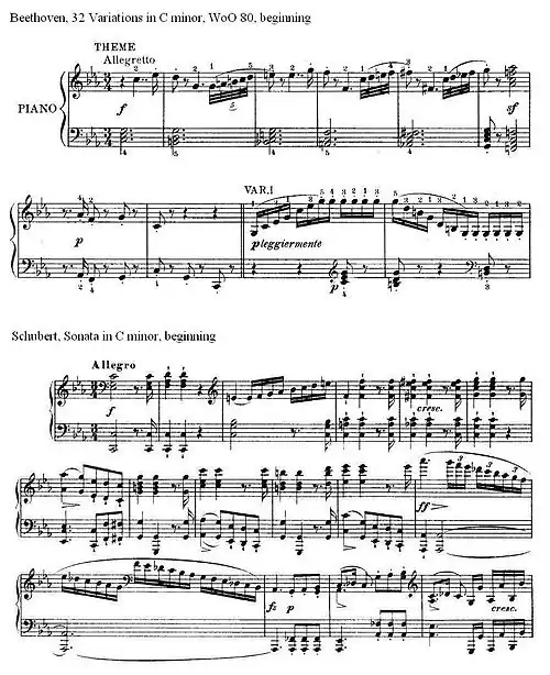 - in the C minor Sonata, certain passages in the first two movements resemble parallel passages from Beethoven's Piano Sonata No. 8, Op. 13 (the Pathétique), written in the same key.[75]